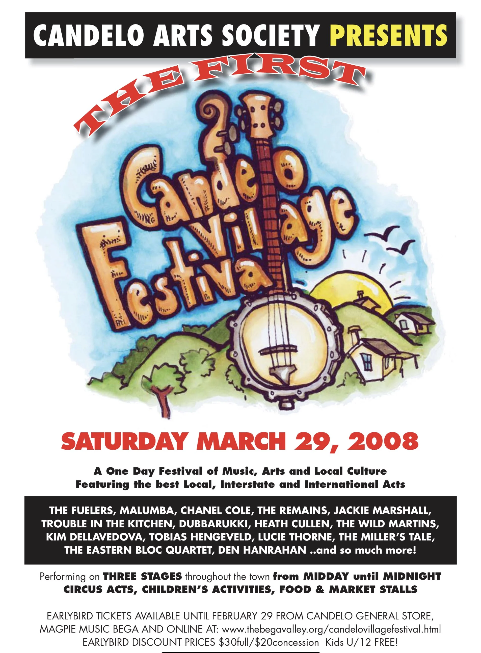 Every two years we produce the Candelo Village Festival, a rich and diverse one-day festival of music, art, performance and local culture in the small village of Candelo, located in the Bega Valley of New South Wales.